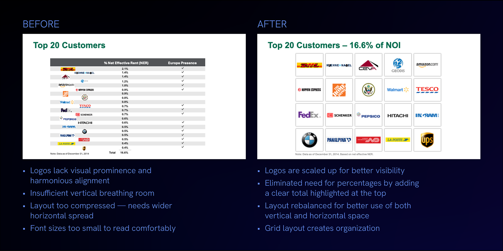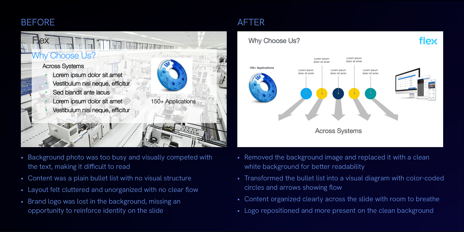 Every project begins with listening. These before and after comparisons from past client work are each a collaborative process of identifying what wasn't working and making intentional design decisions to fix it. From improving readability and spatial balance to refining how information is structured and presented, the goal is always the same: slides that communicate clearly.